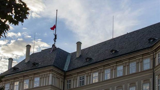 Çek Cumhuriyeti'nde protestocular, devlet başkanlık sarayının çatısında dalgalanan bayrağı indirdi, yerine kırmızı bir don astı.