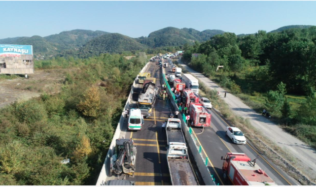 D-100 karayolunun İstanbul yönünde seyir halinde olan 44 yaşındaki Faik Mintaş'ın kullandığı tır, Darıyeri Hasanbey mevkisinde rampayı inerken sürücüsünün kontrolünden çıkarak aynı istikamette seyreden 2 cip, 2 otomobil ve 1 hafif ticari araca çarptı.Mintaş idaresindeki tır, son olarak Yılmaz Boçgün hakimiyetindeki tırın dorse kısmına vurduktan sonra yaklaşık 35 metre sürüklendi.Kazadan sonra şoför mahallinde sıkışan Mintaş, çarpışmanın şiddetiyle tırda çıkan yangın nedeniyle yaşamını yitirdi. Kazanın 112 Acil Çağrı Merkezi'ne ihbar edilmesinden sonra kaza mahalline çok sayıda itfaiye, sağlık, polis ve jandarma ekibi yönlendirildi. Tırda çıkan yangını itfaiye ekipleri müdahale ederek söndürdü. Kazada yaralanan 7 kişi, sağlık ekipleri tarafından kaza mahallinde yapılan ilk müdahalenin ardından ambulanslarla Düzce'deki hastanelere nakledildi. Kaza nedeniyle ulaşıma kapatılan D-100 karayolunun İstanbul yönü, araçların kaldırılmasından sonra normale döndü.Editör: Şener Koştu