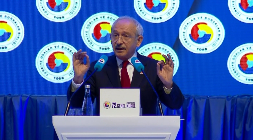 CHP Genel Başkanı Kemal Kılıçdaroğlu, TOBB Genel Kurulu’nda yaptığı konuşmada iş dünyasının yaşadığı sorunların çok daha açık dile getirilmesini istediğini belirterek, genel kurullarda Türkiye’nin ekonomi ve siyasetinin masaya yatırıldığını ifade etti. İş dünyasının ve Türkiye’nin içinde bulunduğu sorunları ana başlıklar halinde sunmaya çalışacağını anlatan Kılıçdaroğlu, Türkiye’nin tarihin en derin krizlerinden birinin yaşandığı ve Genel Kurul’a Türkiye Cumhuriyeti Başbakanının katılamadığını savundu. Son iki seçimde Başbakan Ahmet Davutoğlu’nun başarı elde ettiğini söyleyen Kılıçdaroğlu, "Geldi başbakanlık koltuğuna oturdu, yasalara, anayasaya göre. Bir sabah kendisini saraya çağırdılar, görevi bırakacaksın. Neye göre bırakacaksın? 23 milyon 600 bin oy almış siyasi partinin genel başkanına bir kişi diyor ki ’Görevi bırakacaksın’. Demokrasi bu mu? Bu oyları çöpe atmaya kimin hakkı ve yetkisi var?" diye konuştu.