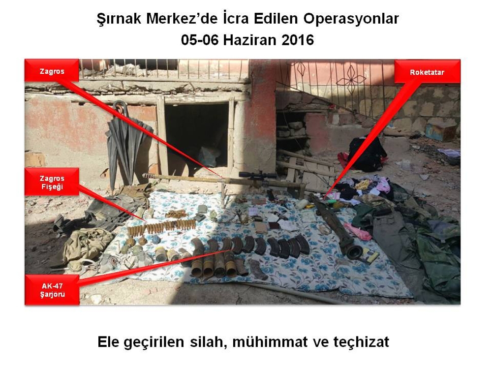 Güvenlik kaynaklarından alınan bilgilere göre, Şırnak il merkezinde 5-6 Haziran 2016 tarihlerinde icra edilen arama tarama faaliyetinde bölücü terör örgütü mensuplarının yollara ve evlere tuzakladıkları el yapımı patlayıcılar ile el yapımı patlayıcı yapımında kullanılan malzemeler bulunarak imha edildi. Ayrıca teröristlerin vatandaşların evlerinin duvarlarını yıkarak açtığı mevziiler tespit edildi. Yapılan kapsamlı arama tarama faaliyetleri esnasında çok miktarda silah, mühimmat ve teçhizat bulunduğu öğrenildi.